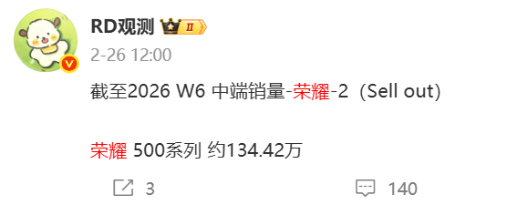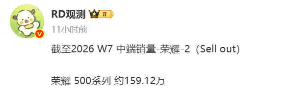 【CNMO科技消息】近日,博主“RD观测”统计了截至2026年第7周的荣耀500系列最新销量数据。数据显示,荣耀500系列累计销量已达约159.12万台。