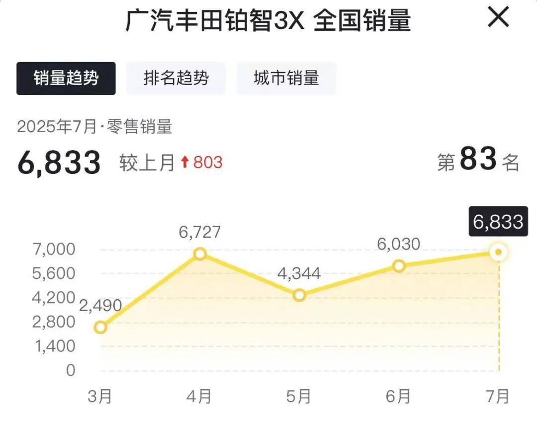 3月份,广汽丰田铂智3X一经上市便受到市场热捧;而6月份上市的一汽丰田bZ5,市场表现却不尽如人意。据第三方数据显示,7月份铂智3X销量达到6833辆,虽未破万,但已创下历史新高,稳坐合资新能源车型销量榜首。相比之下,bZ5自6月10日上市后的20天内仅售出1409辆,7月份作为首个完整销售月,销量也仅微增至1494辆,增长陷入停滞。